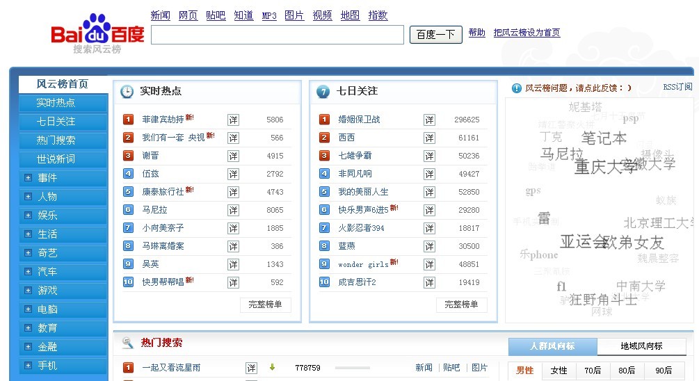 8月23日晚百度搜索风云榜新版正式上线,强大的产品功能和便捷的信息服务,为4亿网民带来了一次用户体验的完美升级!新版风云榜以百度每天数亿次搜索为基础,从用户需求出发,突出了开放、实时、全方位及整合四个新特点,目的是将百度风云榜打造成为最权威的中文搜索风云榜。