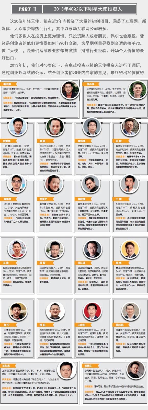 我们之所以把榜单的准入点定为“40岁以下”,就是想通过挖掘新一批的优秀早期投资人,来推动中国创投产业正规、良性、有序发展。囿于我们的视野,入围的这40个人,不一定涵盖了中国最优秀的早期投资人,但他们无不凭借自己的业绩在各自供职的机构或领域快速成长。入围的核心标准就是所投项目及其估值涨幅。